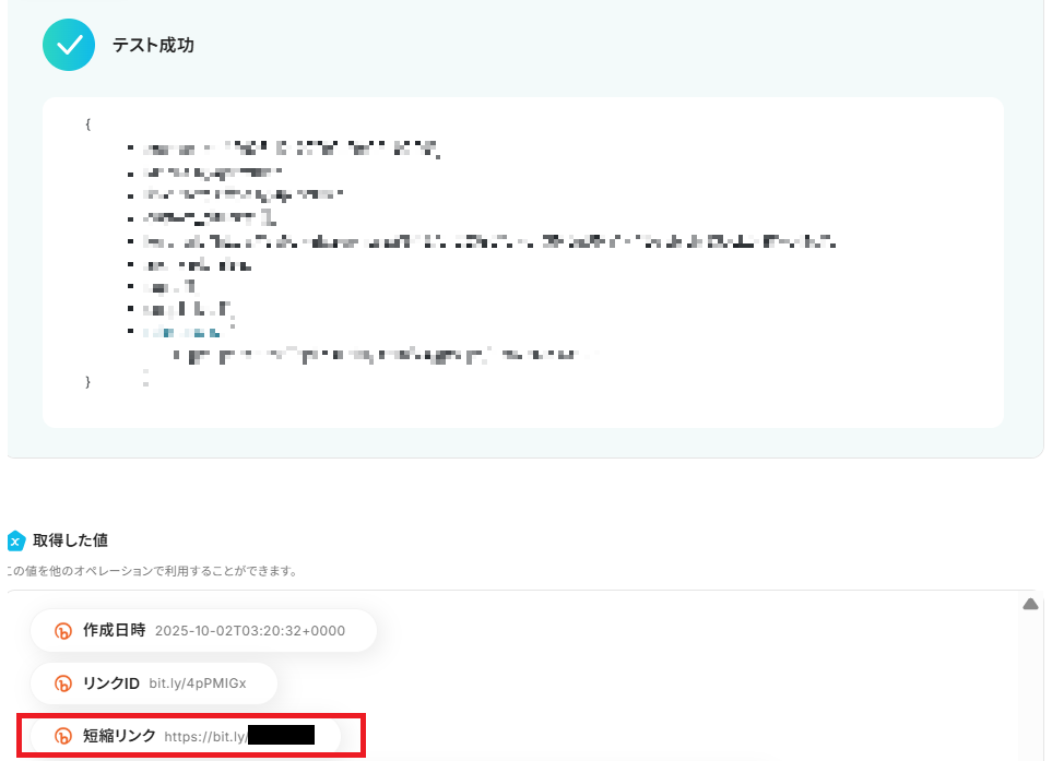 - 次に、オペレーションでBitlyの「リンクを短縮する」アクションを選択し、抽出したURLを処理するよう設定します。