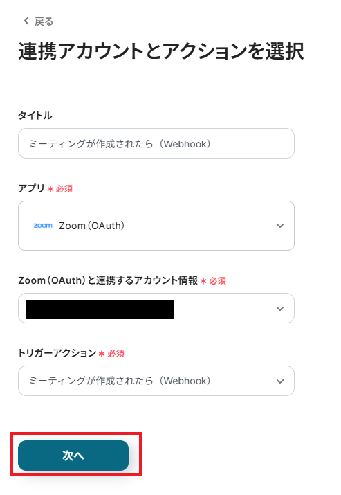 連携アカウントとアクションを確認します。問題なければ「次へ」で進みます。