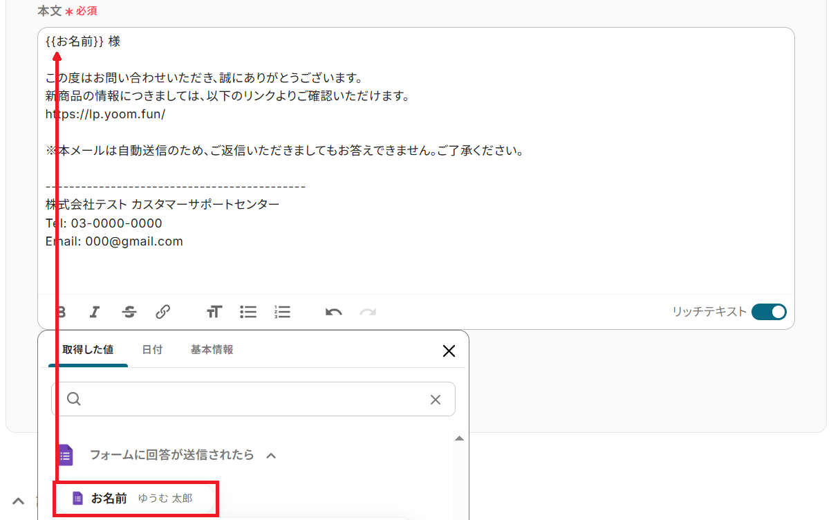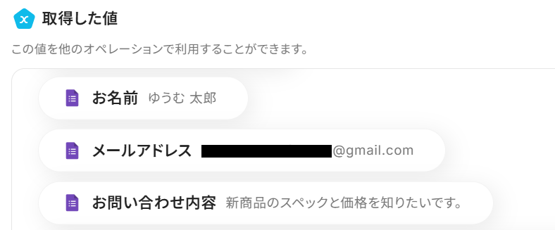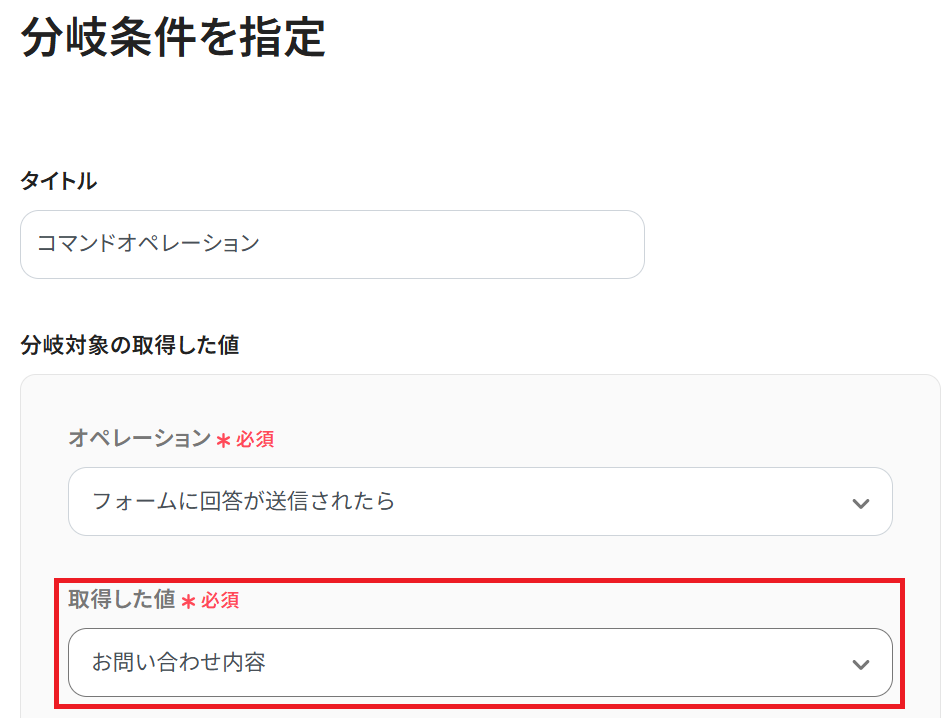 取得した値の欄には、プルダウンから「お問い合わせ内容」を選択しましょう。