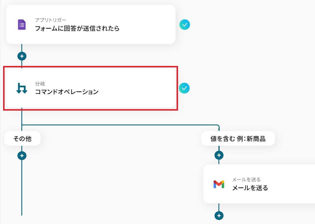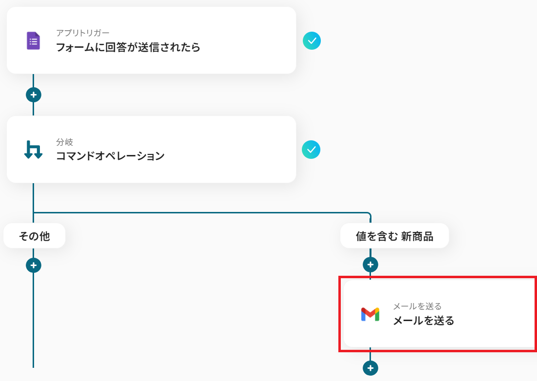 次に分岐条件を設定します。今回は例として、お問い合わせ内容に「新商品」という文字列が含まれている場合にメールを送るよう設定しています。