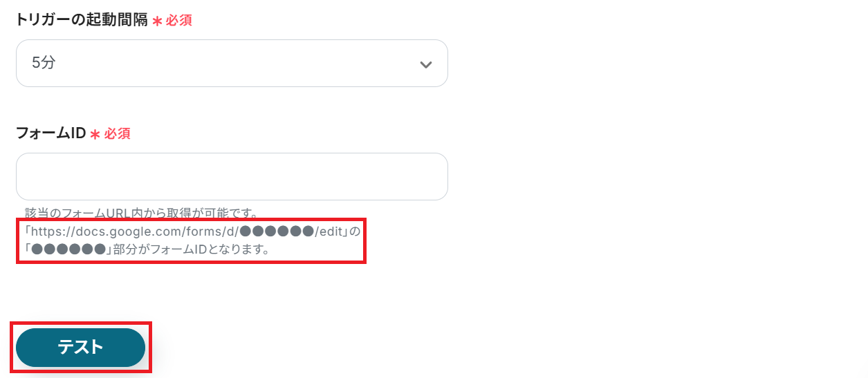 Googleフォームの用意ができたらYoomの設定画面に戻り、トリガーの起動間隔とフォームIDを入力してテストしてください。
