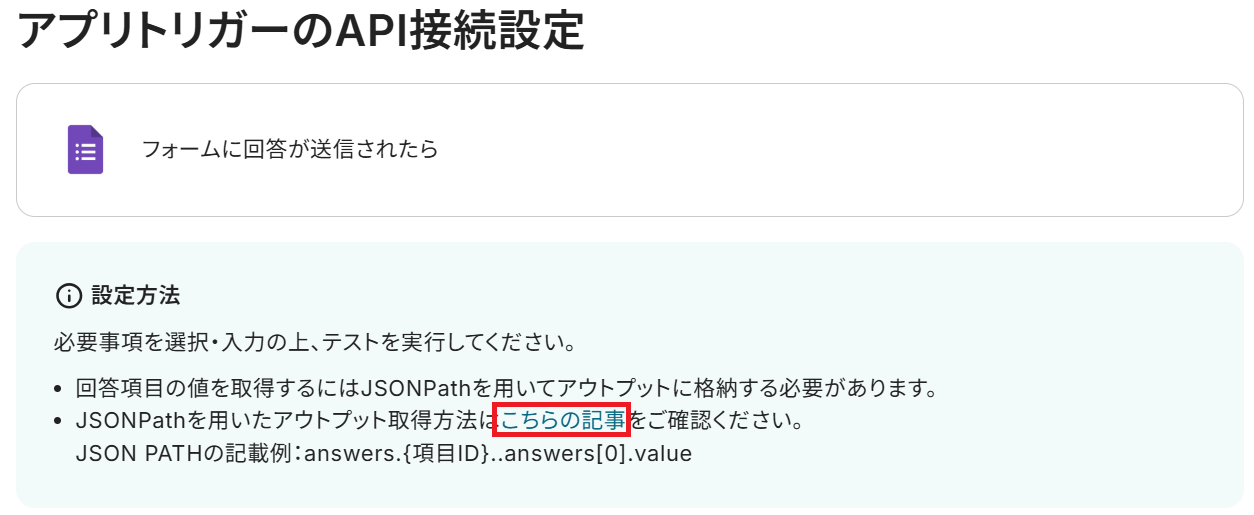 ・Googleフォームをトリガーとして使用した際の回答内容を取得する方法は下記を参照ください。