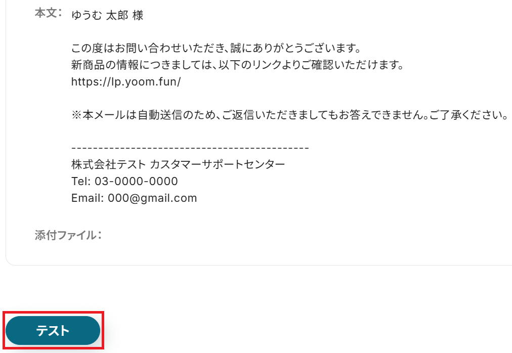 このフローを活用することで、AIが問い合わせ内容を自動で解析し、適切な自動返信を行うことで、迅速かつ効率的な対応が実現します。
