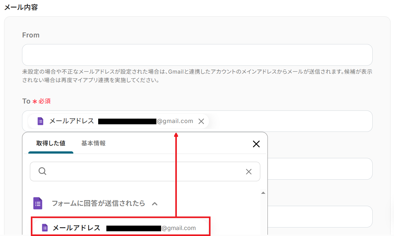 Toの欄は、ステップ3で取得したアウトプットの値を選択してください。