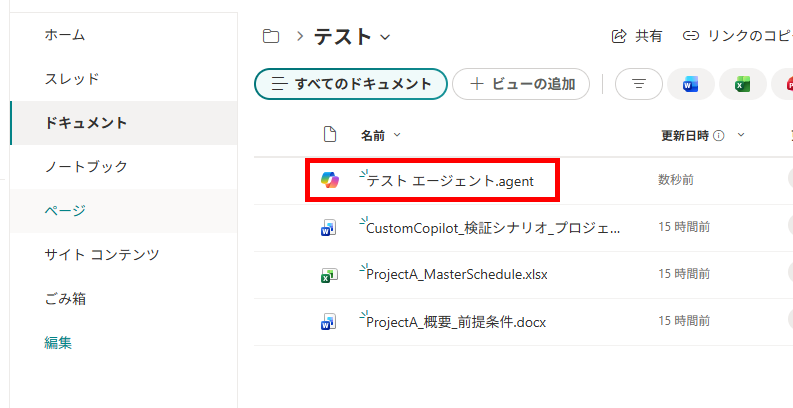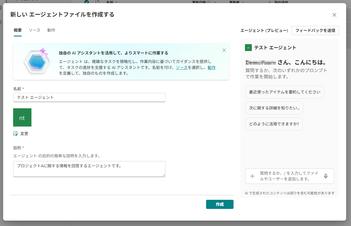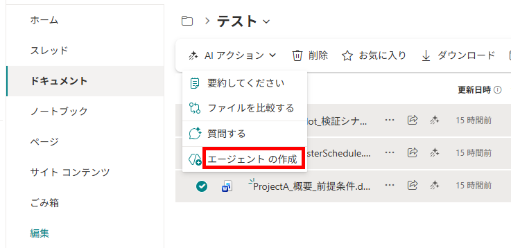 エージェントを作成 今回は、プロジェクトAという架空のプロジェクトに関する情報が記載されているファイルを3つ用意し、それらを参照するエージェントを作成していきます。SharePointで参照するファイルを選択し、メニューの「AIアクション」から「エージェントの作成」を選択します。