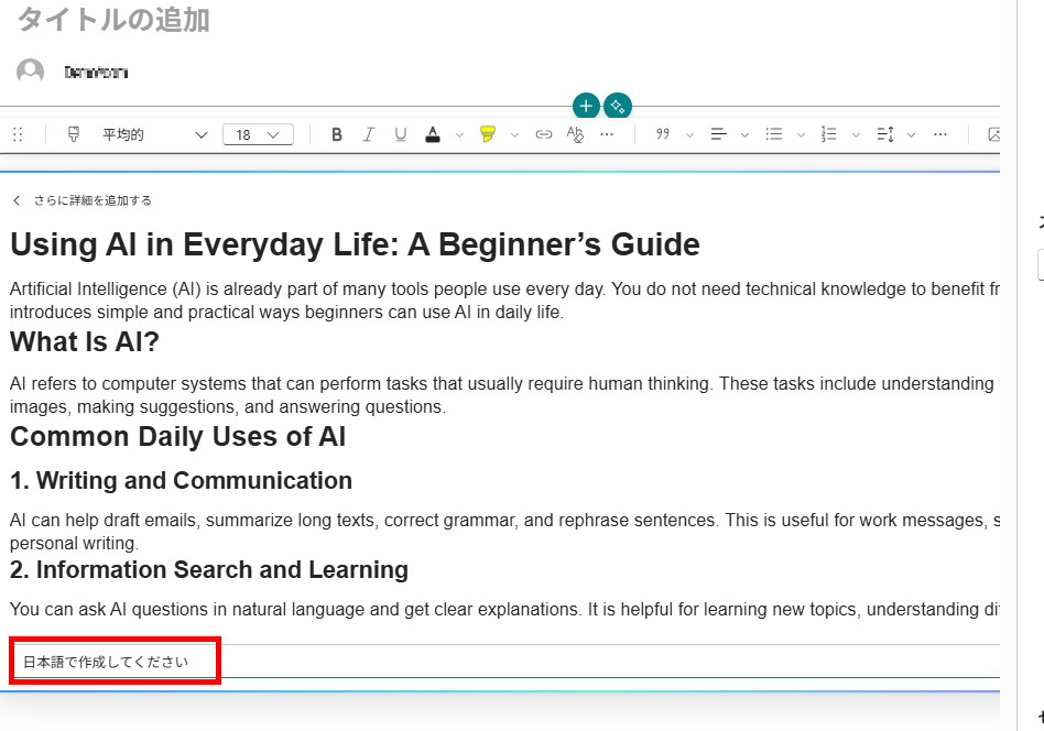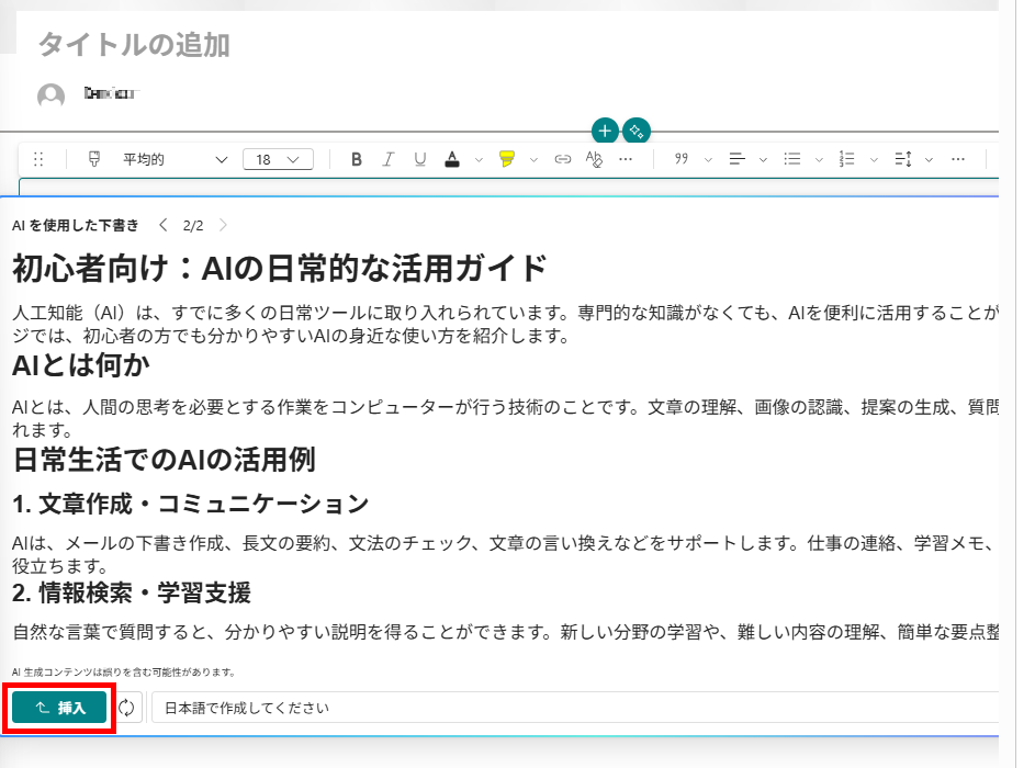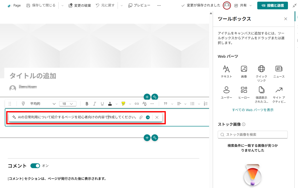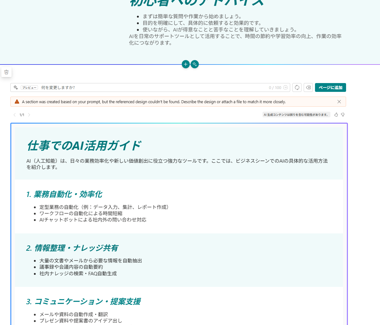 検証2:SharePointページの自動生成を検証 次に、SharePointページを自動で生成できるかを検証しました。今回は、AIの日常利用に関するページを作成してみました。