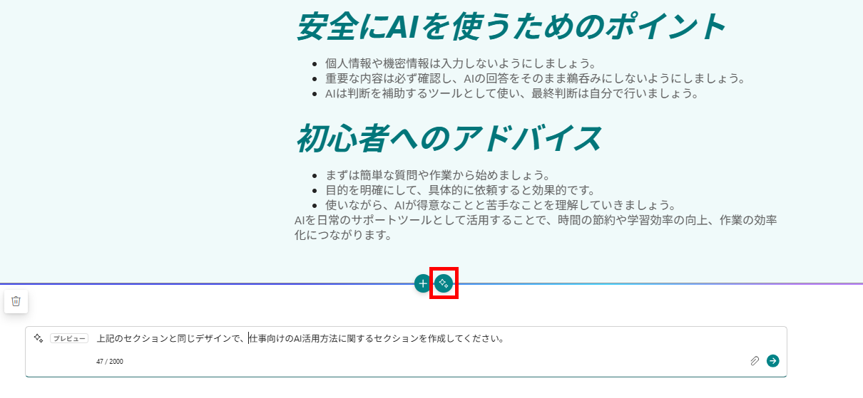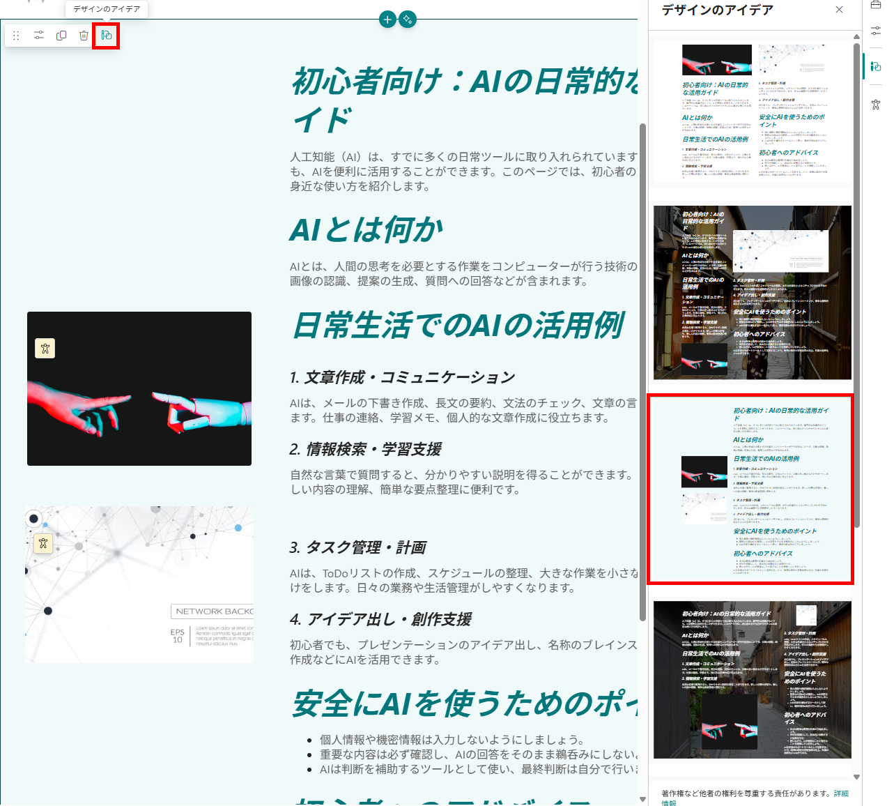 今回は、デザインの指示をしませんでしたが、「デザインのアイデア」から任意のテンプレートを選択すると、自動でレイアウトが調整されたセクションが作成されました。
