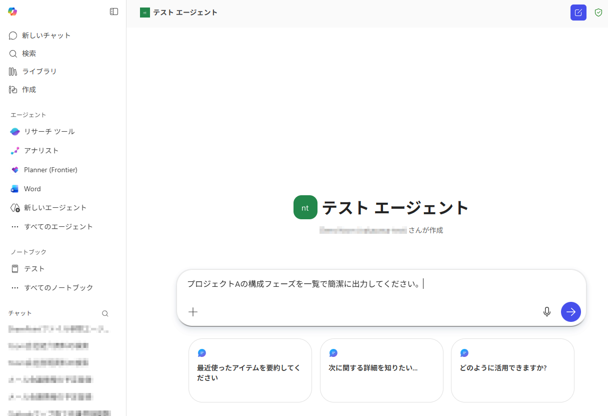 検証 それでは、作成したエージェントの挙動を確認していきます。エージェントを開くと、Copilot Chatが立ち上がります。以下のプロンプトを入力して送信しました。