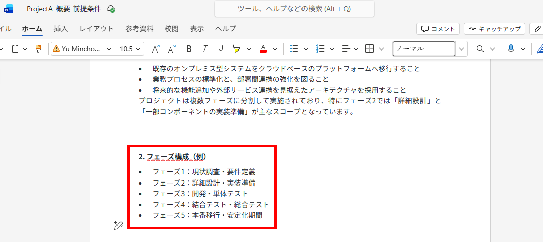 プロジェクトAの構成フェーズを一覧で簡潔に出力してください。
