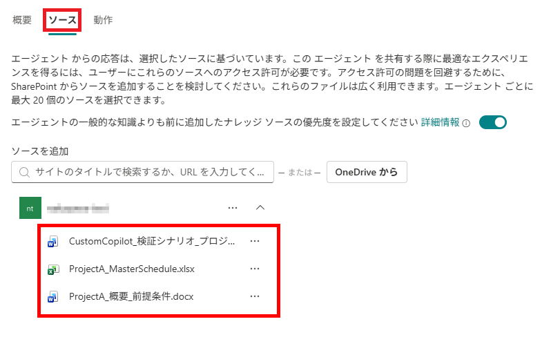 検証1:特定プロジェクト専用の「カスタムCopilot」を作成 まずは、社内の特定プロジェクトに関する資料だけを読み込ませたカスタムCopilotを作成し、その精度を検証しました。SharePointのドキュメントライブラリで、複数のファイルをナレッジソースとして指定し、エージェントを構築していきます。