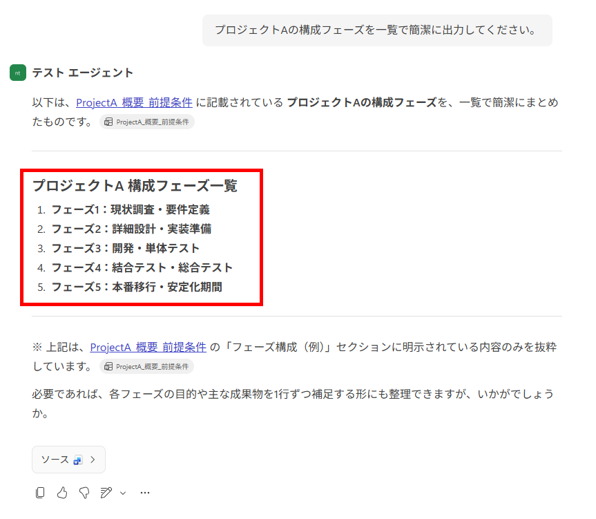 さらに、AIが参照元のファイルから情報を正確に読み取って出力していることも確認できました。この処理精度の高さから、SharePointに蓄積された社内データを効果的に活用し、日々の検索業務を効率化できる実用的なツールであると言えます。