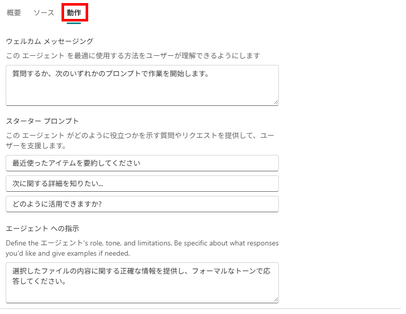 「動作」では、どのようなエージェントとして振る舞って欲しいかを設定します。設定が完了したら、「作成」をクリックして完了です。