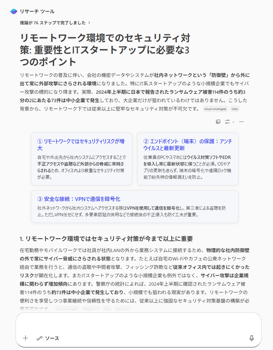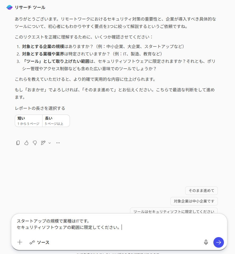 実際にリサーチエージェントを活用してみると、ユーザーの指示に不足している情報がある場合、AI側から逆質問をしてくれることが大きな魅力だとわかりました。プロンプトエンジニアリングの専門的な知識がなくても、AIとの対話を通じて自然と条件が絞り込まれるため、的外れな回答を防ぐことができます。 今回の検証では、情報の出力までに約8分という時間がかかりましたが、その分、通常のチャットAIを使用するよりもはるかに濃密で専門的な情報を得ることができました。 時間をかけてでも深く詳細なリサーチを行いたい場面では、非常に頼りになる存在です。 Microsoft 365 Copilotの有料アドオンを導入すれば、こうしたタスクに特化した優秀なAIエージェントを活用できます。 複雑で専門的な業務をAIに任せて効率化を図りたい企業や個人にとって、非常に高い利用価値があると言えます。