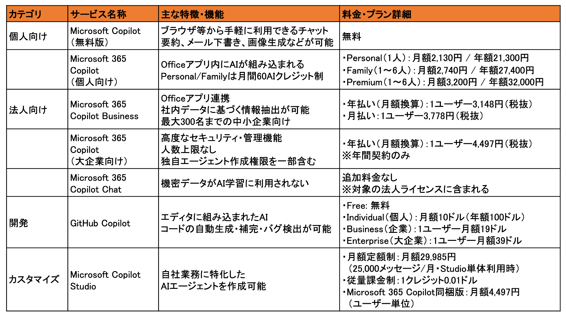 🏢企業・法人向けのCopilotの種類と詳細
