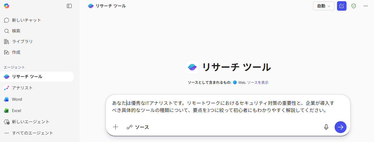 検証1:Copilot ChatのAIエージェントを活用したリサーチ Copilot Chatには特定の役割を持ったAIエージェント機能があり、事前準備なしですぐにリサーチ業務に活用できます。 今回は「リサーチエージェント」としての能力を検証しました。