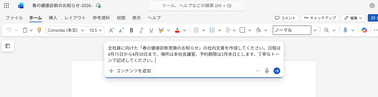 検証2:Copilot in Wordでの資料作成の自動化 Word内のCopilotを使い、文書作成の自動化を検証しました。 白紙の状態から社内向けの案内文を作成するプロセスです。