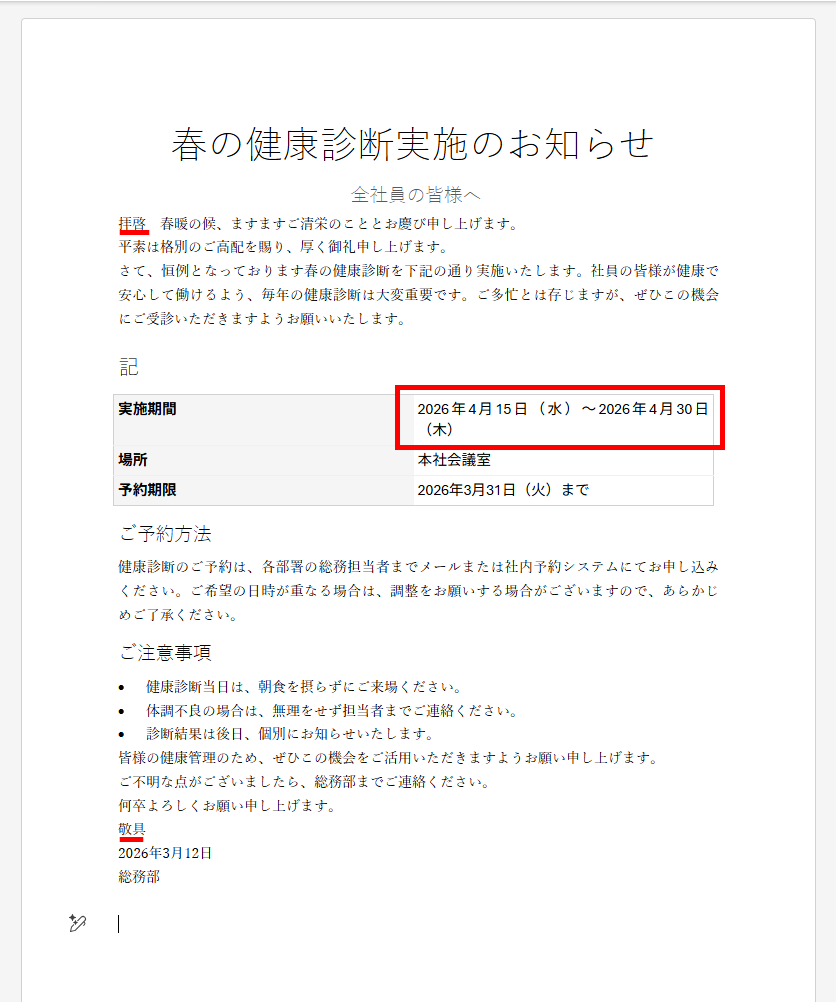 Copilot in Wordを実際に使って資料作成を行うと、Wordの画面を開いたまま直接AIに指示を出せるため、ブラウザとタブを行き来する手間が省けて非常に快適です。生成された文章はそのままドキュメント上に表示され、わずか10秒程度でレイアウトまで考慮されたたたき台が完成しました。 結果をコピー&ペーストして体裁を整える作業が不要になるため、作業スピードが格段に向上します。 ただし、AIが作成した文書が常に完璧というわけではありません。表内のテキストが不自然な位置で折り返されていたり、社内向けの文書であるにもかかわらず「拝啓・敬具」といった不適切な頭語・結語が使われたりするケースもあるため、最終的な人間の目による内容チェックや手直しは必須です。 それでも、無料版のMicrosoft Copilotではできないレイアウトの調整機能などを考慮すると、Microsoft 365アプリを頻繁に利用する方にとってアドオンを契約するメリットは絶大です。