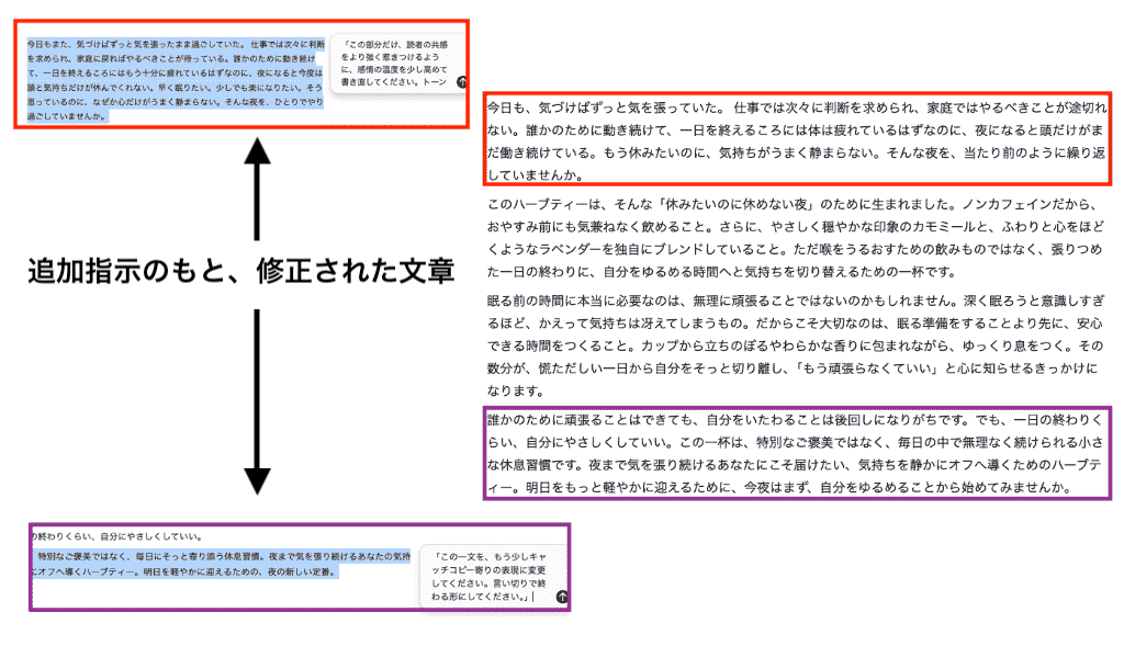 ここまでは今までのチャットと大差ありませんが、Canvasを使えば、修正したい部分だけをハイライトして「ここだけもっと感情的な表現にしてほしい」「この段落を少し短くまとめて」と部分的な指示をピンポイントで出せば、全体のトーン&マナーを保ったまま指摘箇所を自然に書き換えてくれます。