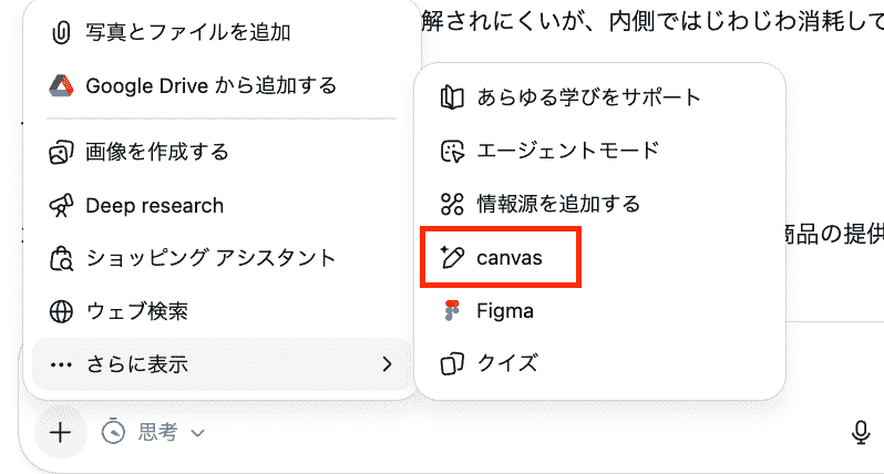 今回は、検証1の結果を引用するためにチャット画面の+ボタンからCanvasを起動します。
