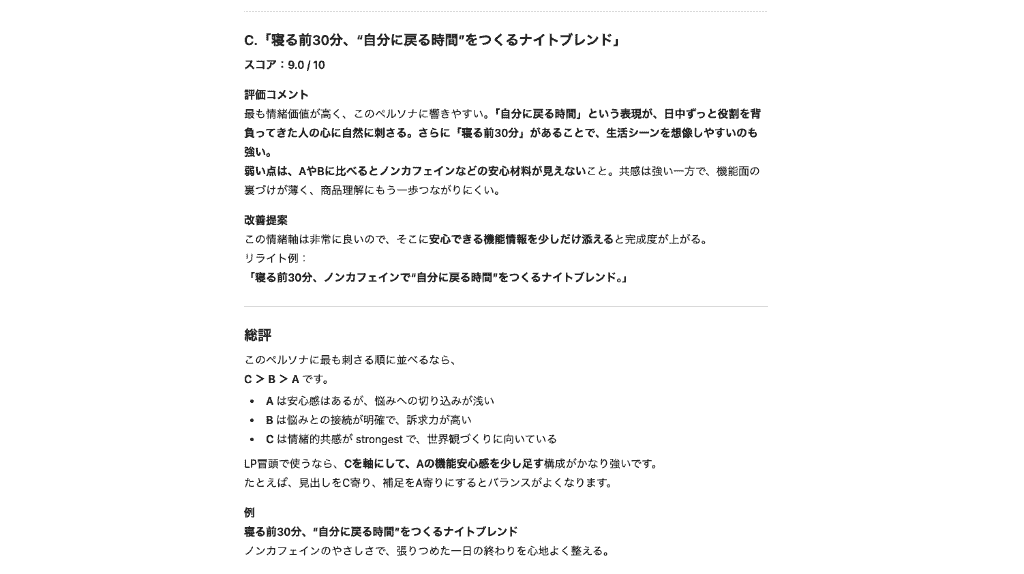 投稿すると、各コピーに対するスコア評価が行われて「C→B→Aがよりペルソナに刺さるコピーの順番となります」といった詳細なフィードバックが返ってきました!