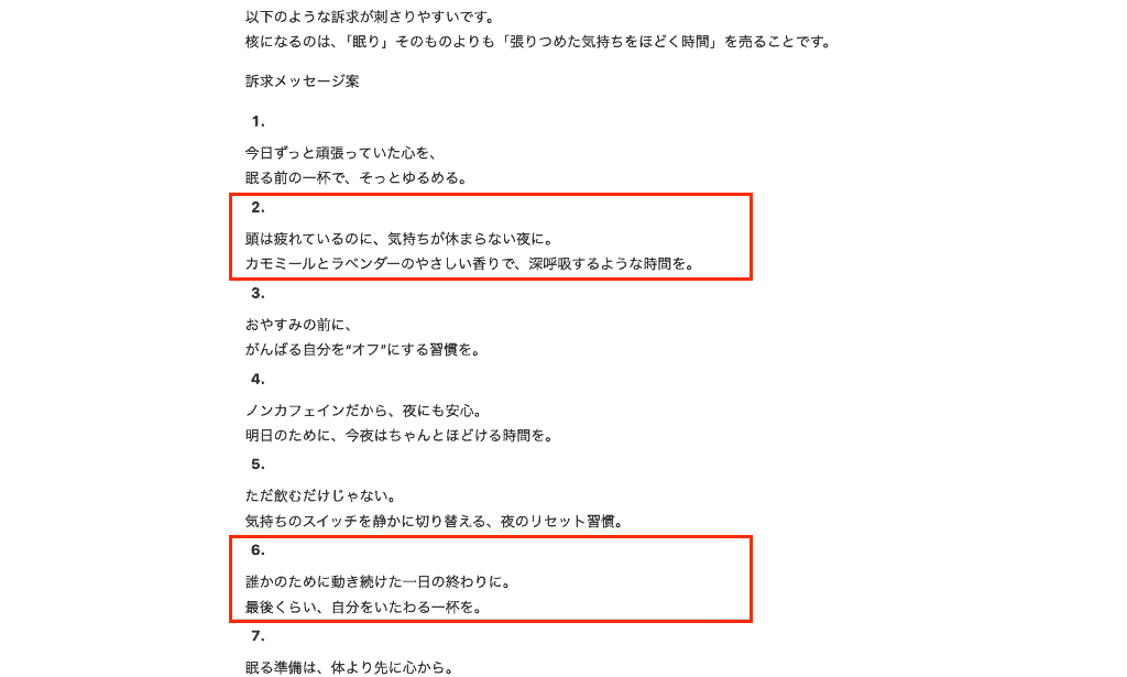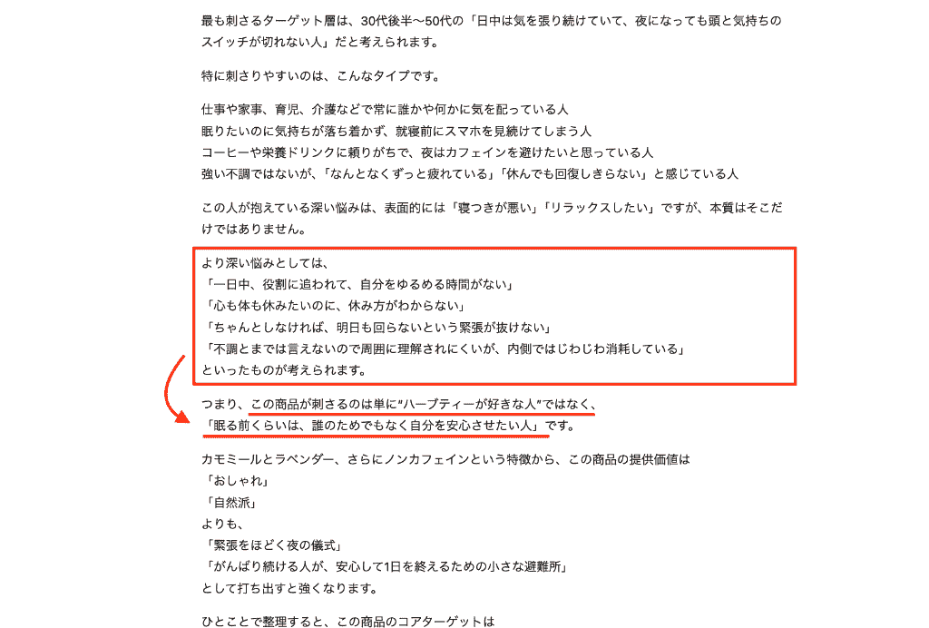 その点から、コアターゲットとなる「休みたいのにうまく休めない人」が求めているのは単なる飲み物ではなく、「安心して1日を終えるための小さな避難所」であるという鋭いインサイトまで導き出してくれたのです。