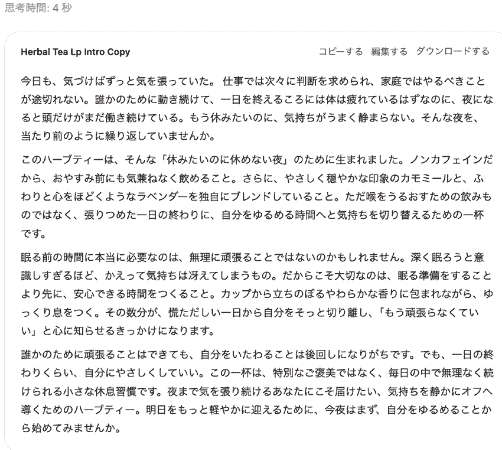 今回は、架空の「睡眠の質を向上させるハーブティー」を題材に、実際にChatGPTを用いて検証を行いました。