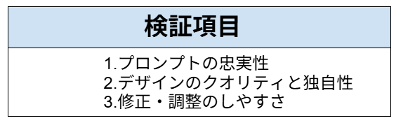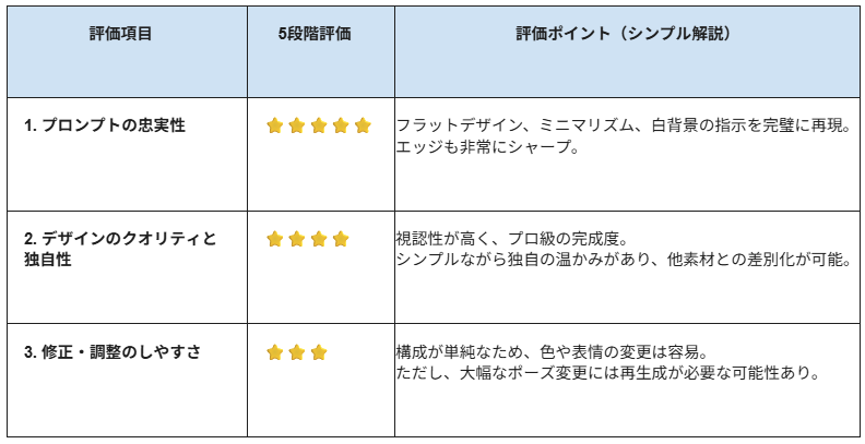 3. 修正・調整のしやすさ 本項目は、この生成結果をベースに、対話を通じて色や表情、ポーズなどの詳細を調整できる「対話型エディタ」としての性能を、生成結果の構造から予測評価します。