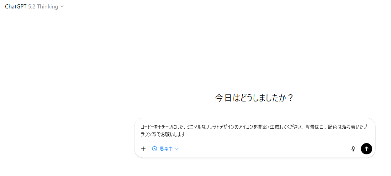 ステップ1:ChatGPT 5.2で「アイコンの核」を生成する まずはChatGPT 5.2に対し、Thinkingモードを有効にして指示を出します。プロンプト: コーヒーをモチーフにした、ミニマルなフラットデザインのアイコンを提案・生成してください。背景は白、配色は落ち着いたブラウン系でお願いします