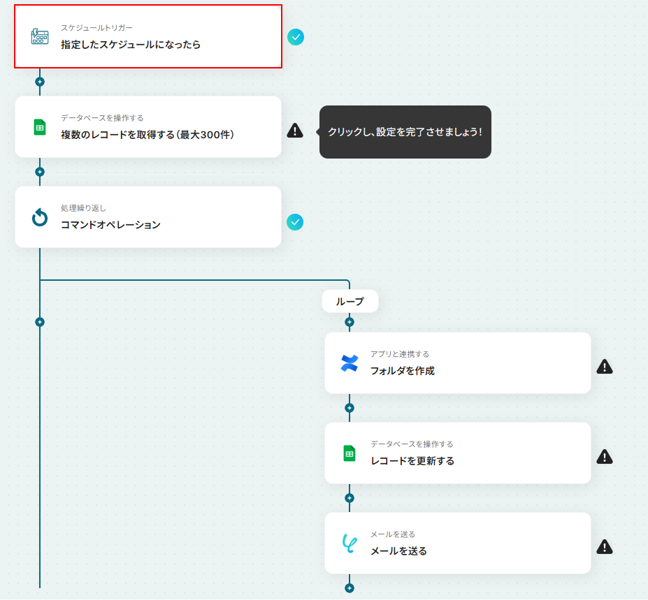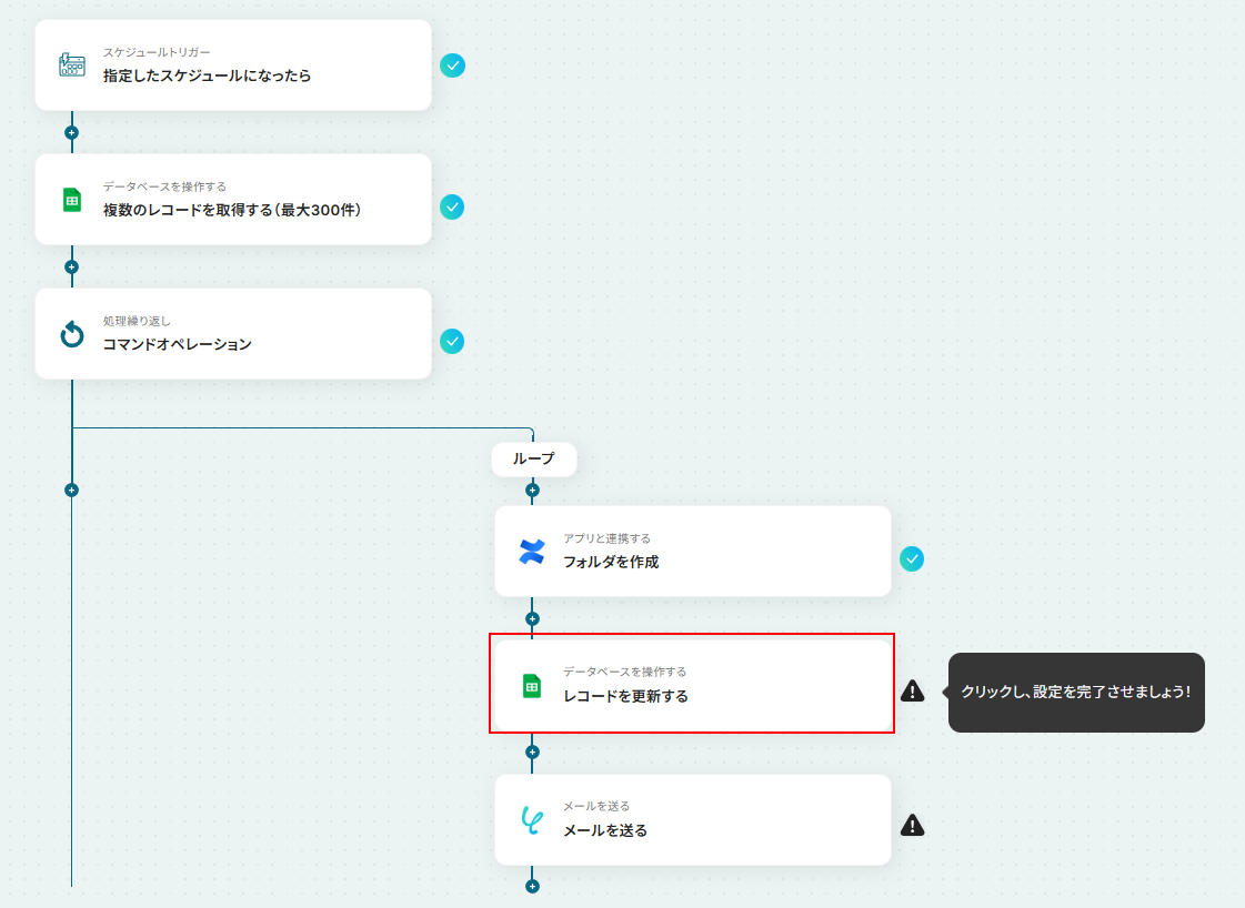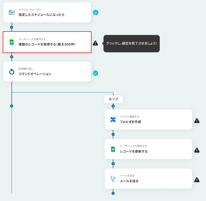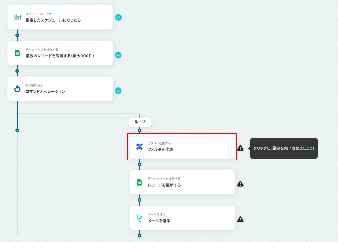 ・「同じ処理を繰り返す」オペレーション間の操作は、チームプラン・サクセスプランでのみご利用いただける機能となっております。フリープラン・ミニプランの場合は設定しているフローボットのオペレーションやデータコネクトはエラーとなりますので、ご注意ください。
