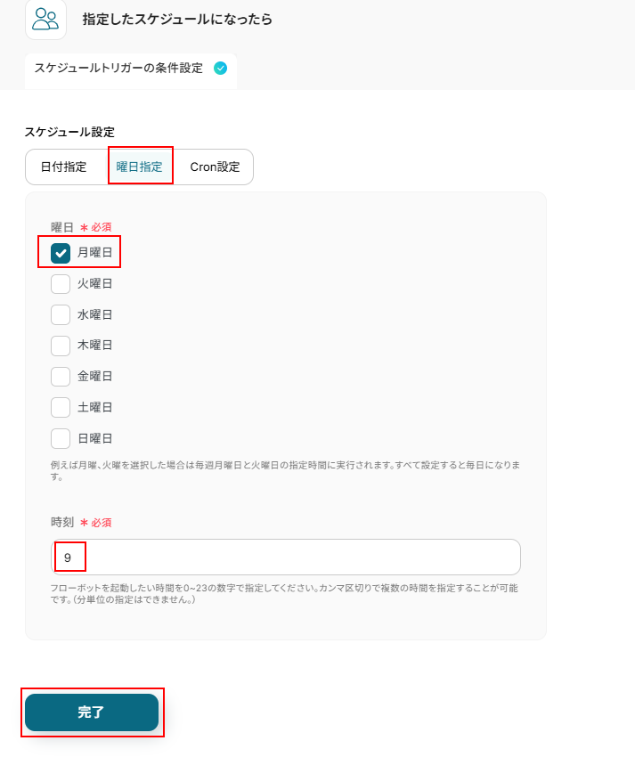 今回デフォルトでは毎週月曜日の朝9時に起動する状態になっています。任意で変更可能なため、修正が必要な場合は変更しましょう。