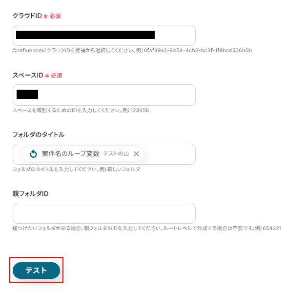 親フォルダID項目について、今回は使用しないため設定しておりませんが、使用したい方は注釈を確認しご入力ください。