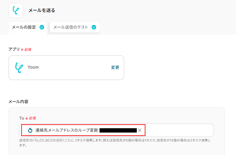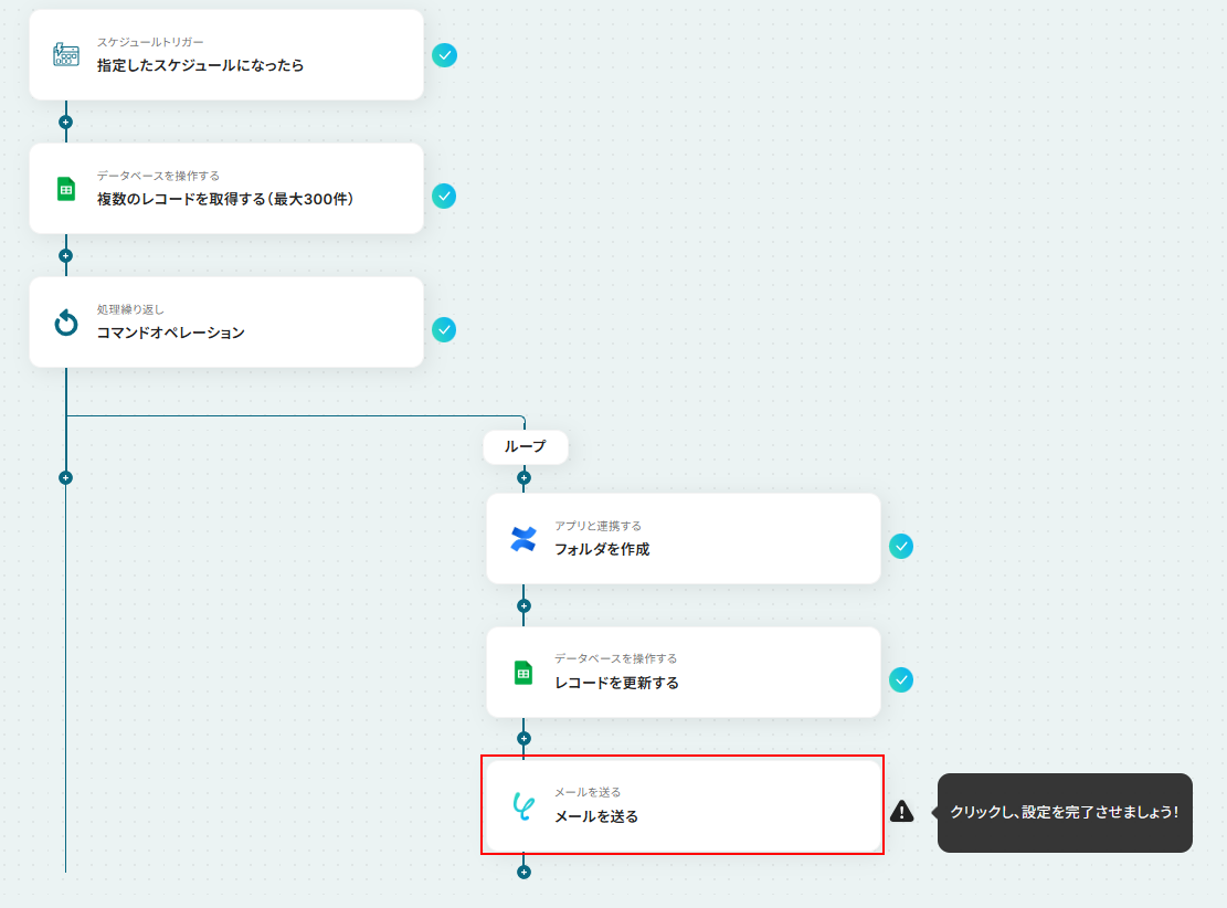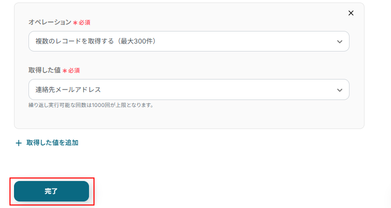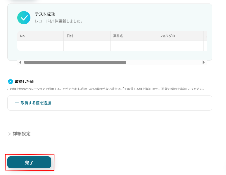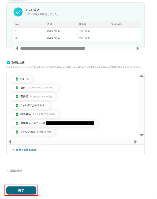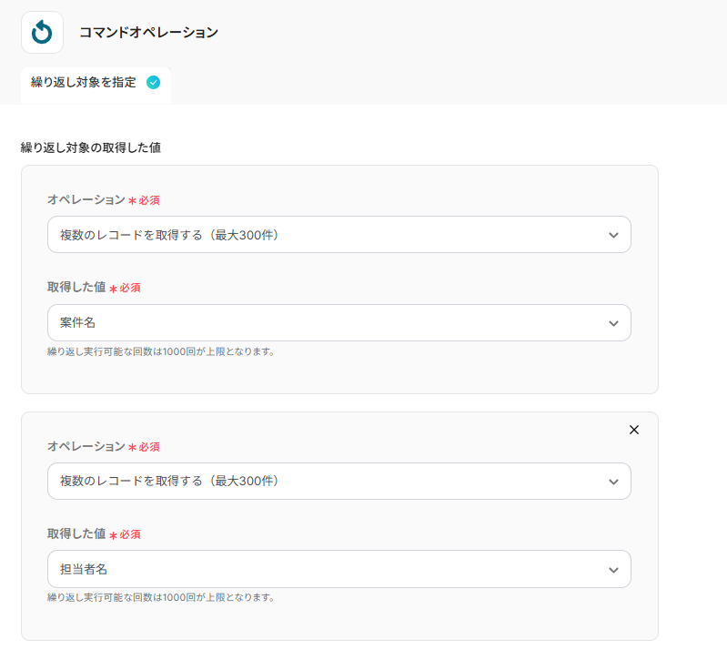 今回は繰り返し対象の取得した値として、案件名、担当者名、連絡先メールアドレスを使用しました。