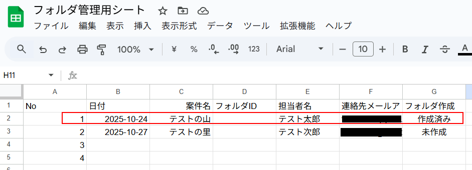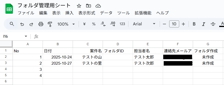 今回はスプレッドシートのフォルダ作成項目が、未作成になっているものを対象にフォルダを作成します。