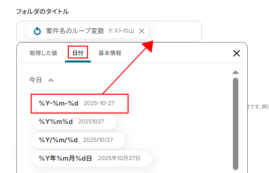 例えばフローボットを起動した日付を入力する場合、入力欄をクリックし日付タブから今日を選択することで今日の日付をフォルダ名に追加できます。