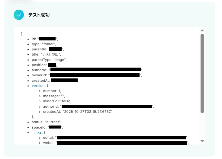 テストに成功するとテスト成功画面が表示され、取得した値が表示されGoogle スプレッドシートのデータが確認できます。