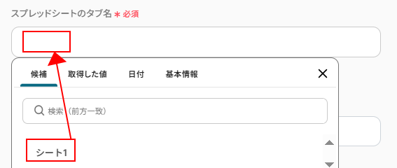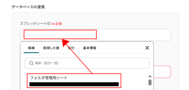 スプレッドシートIDを設定します。入力欄をクリックすると候補が表示されます。