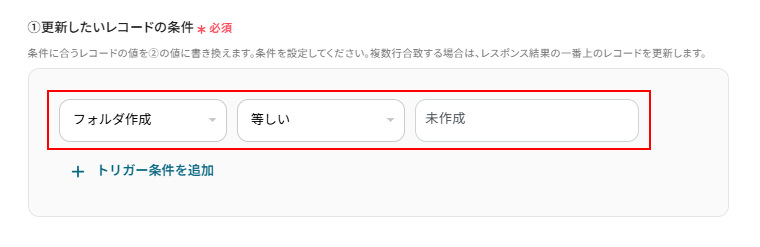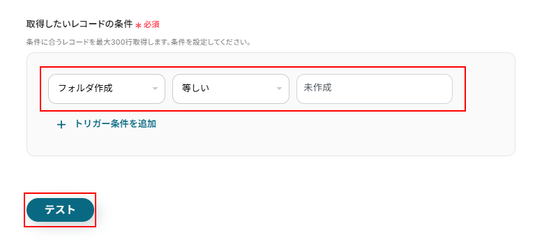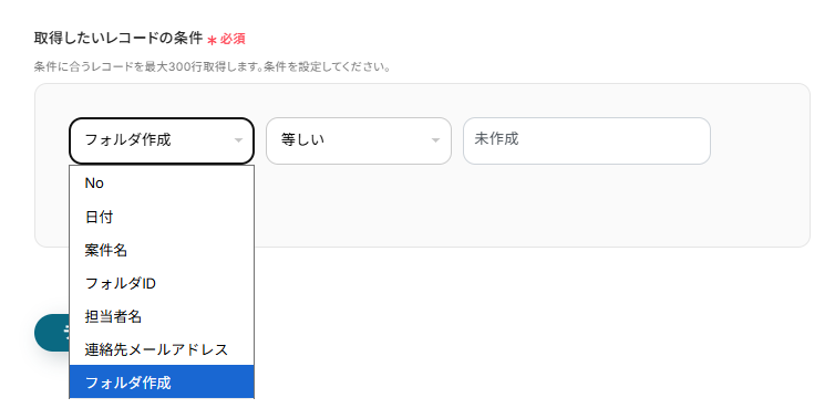 取得したいレコードの条件の左端の項目には、Google スプレッドシートから取得した項目名が表示されますので、フォルダ作成を選択しましょう。