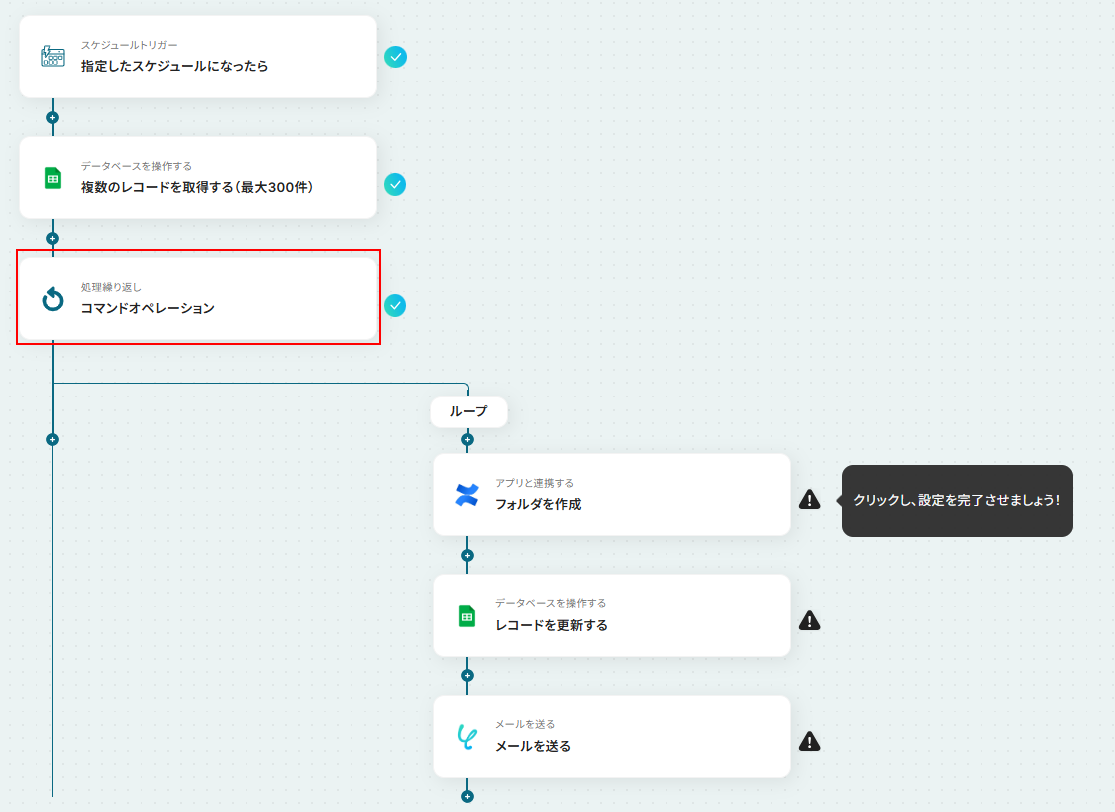 処理繰り返しコマンドオペレーションでは、先ほど取得したスプレッドシートの情報をもとに繰り返し処理を行います。