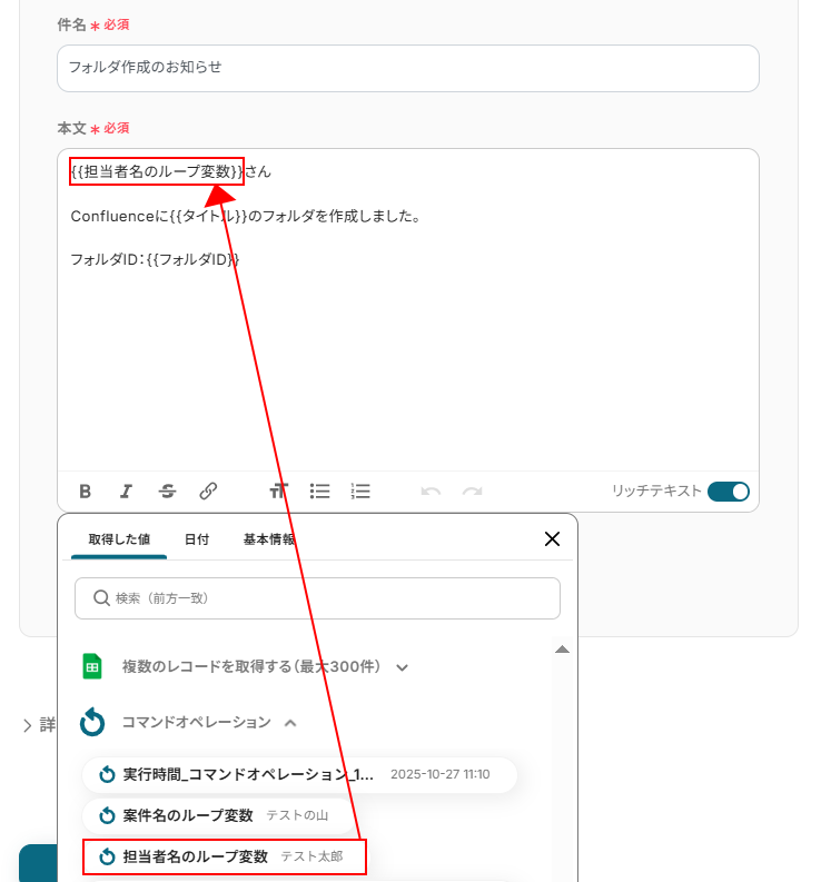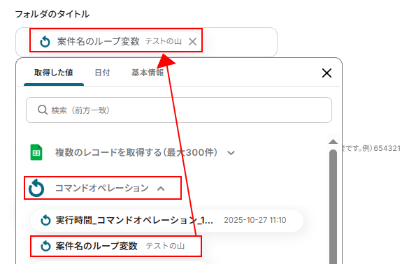 コマンドオペレーションの案件名のループ変数がデフォルトで設定されていますが、以下のように取得した値から選択することも可能です。