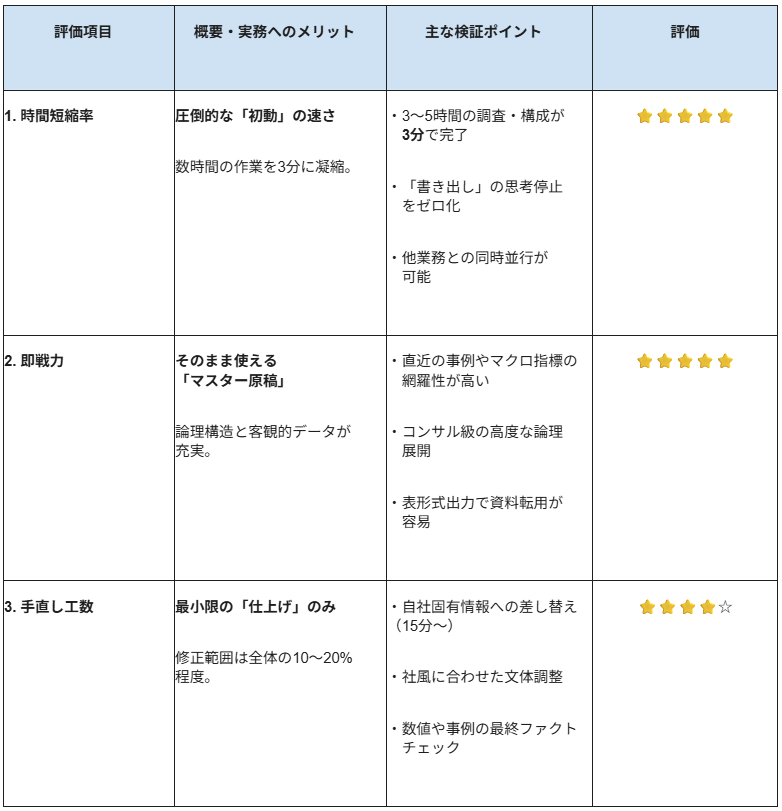 本検証における最大のアドバンテージは、圧倒的な「リサーチと構造化の同時並行」による時短効果です。