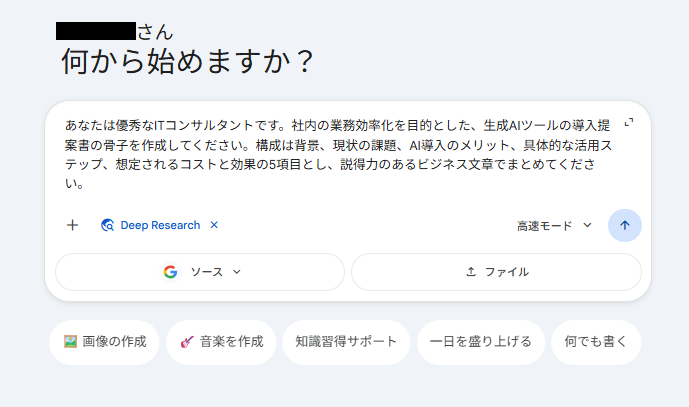 ここからは、先ほどのワークフロー内のステップ1のGeminiの基本機能「Deep Research」を活用した企画書を作成する検証プロセスをご紹介します。