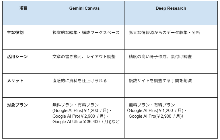 Geminiは、高度な情報処理能力と自然言語生成に優れたAIアシスタントです。企画書作成において特に注目すべきは、「Gemini Canvas」という専用ワークスペースと、「Deep Research」という強力なリサーチ機能です。