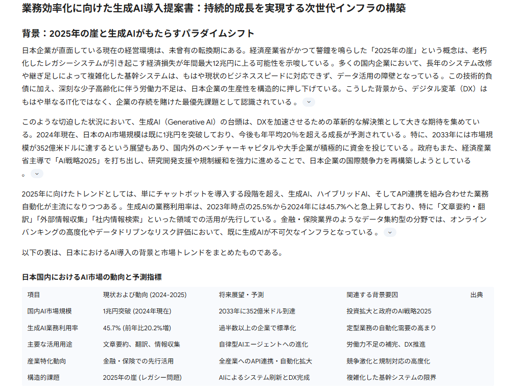 「2025年の崖」といったマクロ指標から、RAGの概念、さらには最新の参照ソース(2025年、2026年版のURL等)が網羅されており、客観的な説得力が非常に高いです。 - 洗練された構成力: