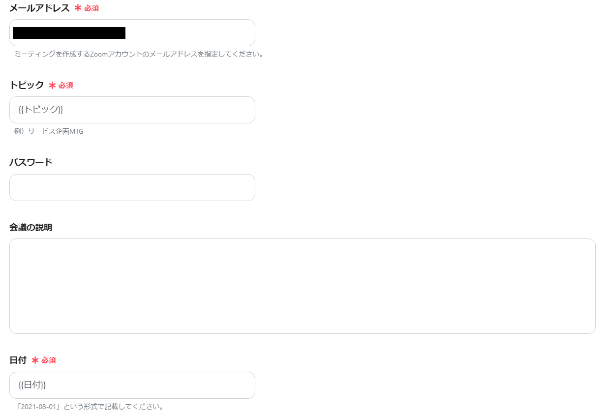 「パスワード」や「会議内容」を記載したい場合は、項目に入力しましょう。