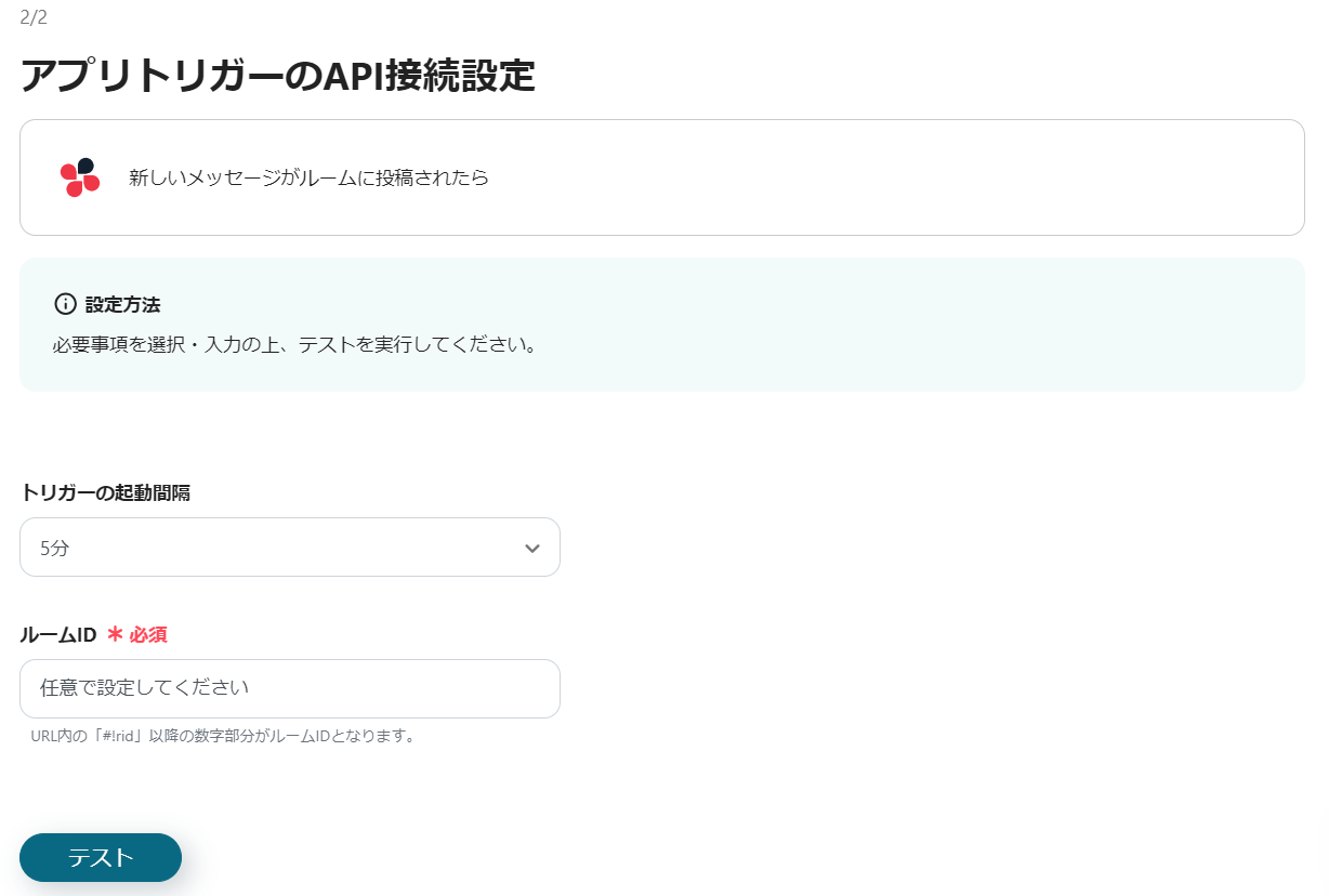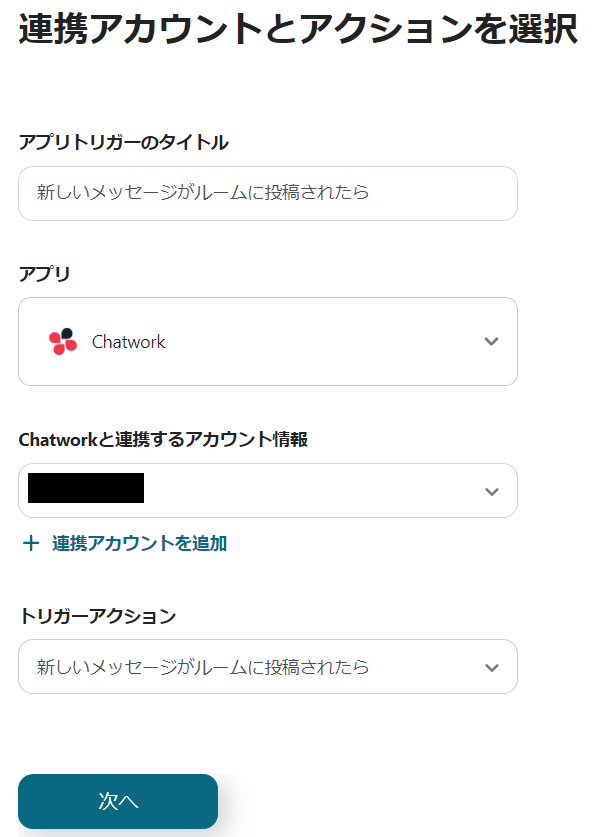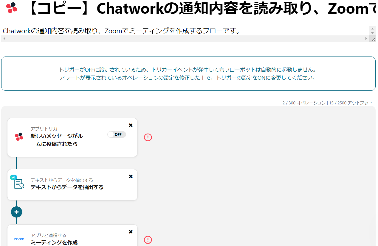 本記事では「Chatworkの通知内容を読み取り、Zoomでミーティングを作成する」というフローの設定を行います。