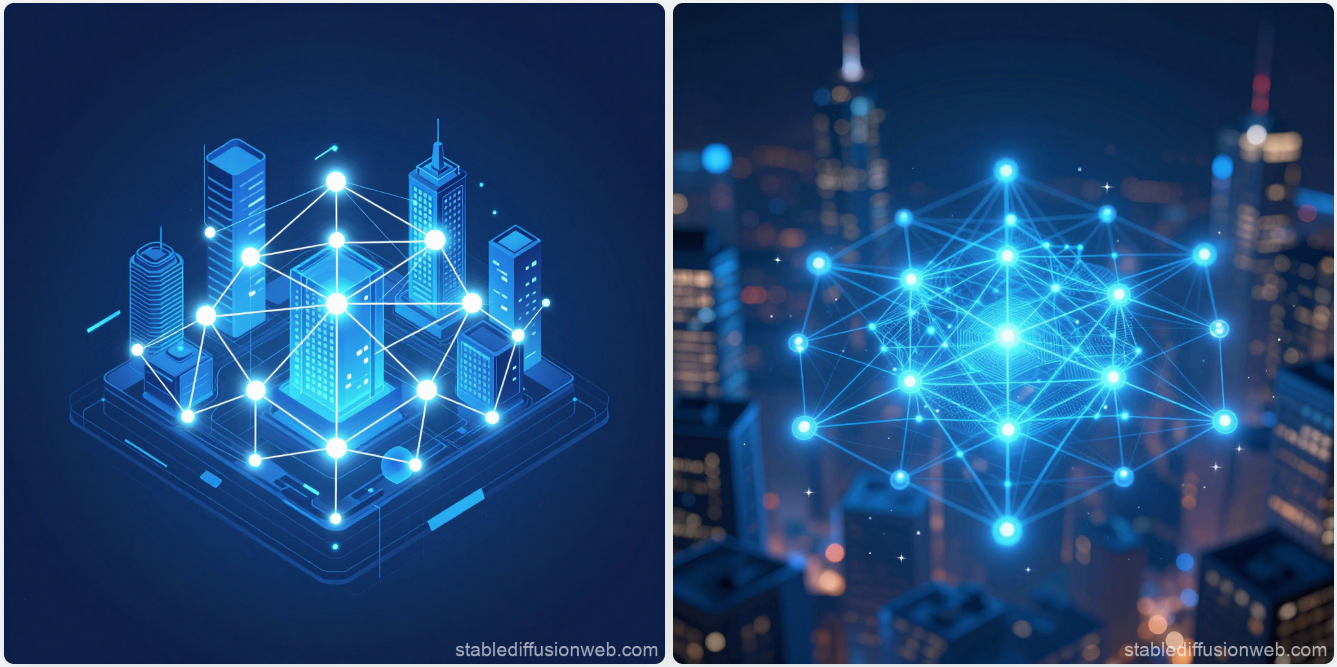 プロンプト: 「abstract business concept art, digital transformation, glowing network connections, futuristic city background, isometric style, high quality, 4k」