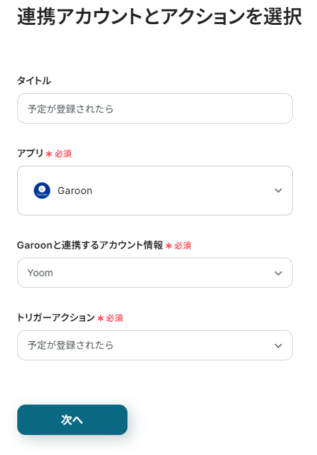 タイトルと連携するアカウント情報を任意で設定し、トリガーアクションはテンプレート通りに「予定が登録されたら」のまま「次へ」をクリックして進んでください。