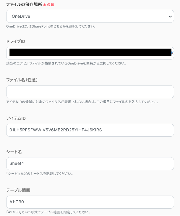 「ファイルの保存場所」はOneDriveかSharePointのどちらかを選択し、その他の項目は注釈を参考に入力します。