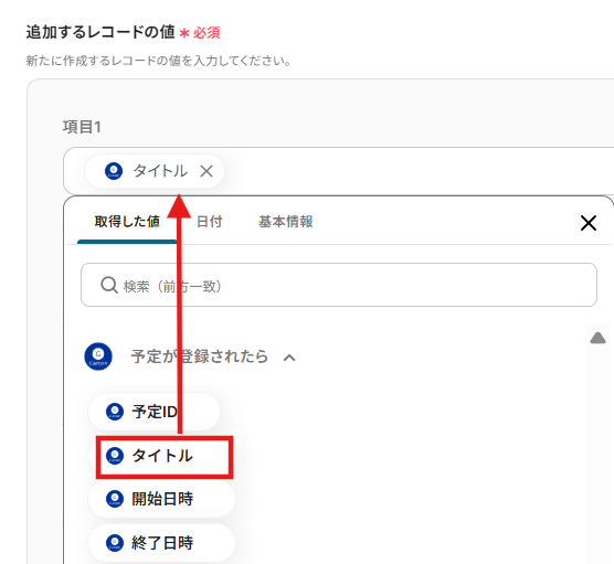 4.「追加するレコードの値」に、先ほど取得したアウトプットをそれぞれ選択します。
