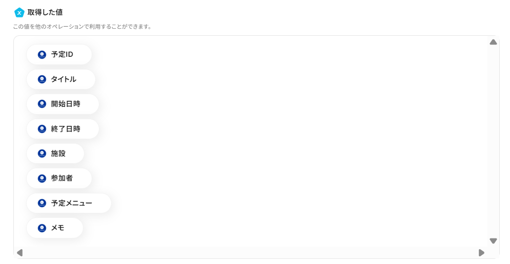 テストが成功した場合は、アウトプット(取得した値)を取得できます。実際の設定では、各項目に具体的な値が反映されます。